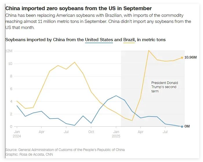 其中,美國有線電視新聞網(wǎng)(CNN)就在一篇11月2日的文章中,引用中國海關(guān)總署的官方數(shù)據(jù)制作了4張簡單的圖表,并以此直觀地呈現(xiàn)出了兩個(gè)大國在博弈時(shí),發(fā)生了哪些變化。