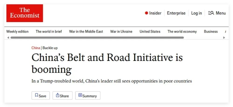 最后值得一提的是,除了CNN這篇報(bào)道中呈現(xiàn)的數(shù)據(jù)圖表,英國《經(jīng)濟(jì)學(xué)人》雜志還在本月的一篇報(bào)道中談到了中國 “蓬勃發(fā)展”的“一帶一路”在這一輪中美博弈中發(fā)揮的積極作用,稱共建“一帶一路”倡議促進(jìn)了中國的貿(mào)易多元化。