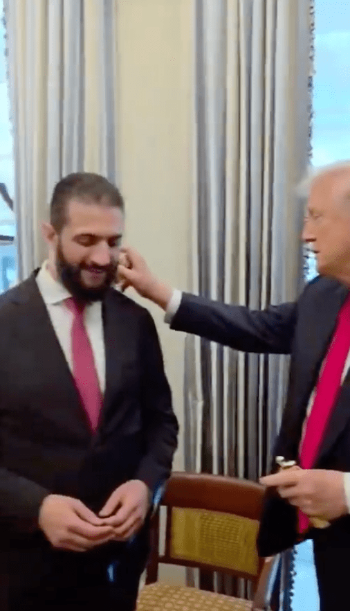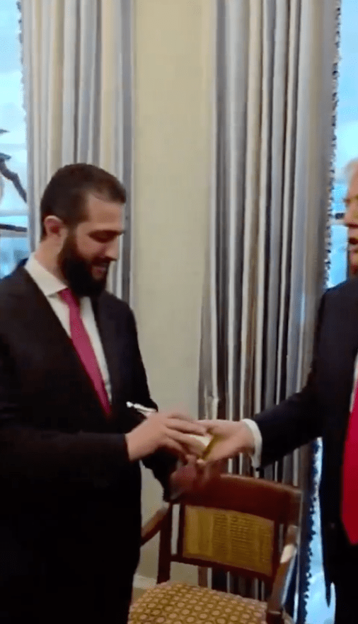 現(xiàn)年43歲的沙拉是前“基地”指揮官,曾被美國列入恐怖份子名單、懸賞一千萬美元緝捕,如今卻首度踏入白宮,成為自1946年敘利亞脫離法國殖民以來,首位訪問美國的敘利亞領(lǐng)導(dǎo)人。特朗普在會面中親手送上自家品牌“Trump”的香水作為禮物,甚至當(dāng)場替沙拉噴上香氣,笑言:“這是最好的香味,另一瓶給你太太?!彪S后他調(diào)皮追問:“你有幾個老婆?”