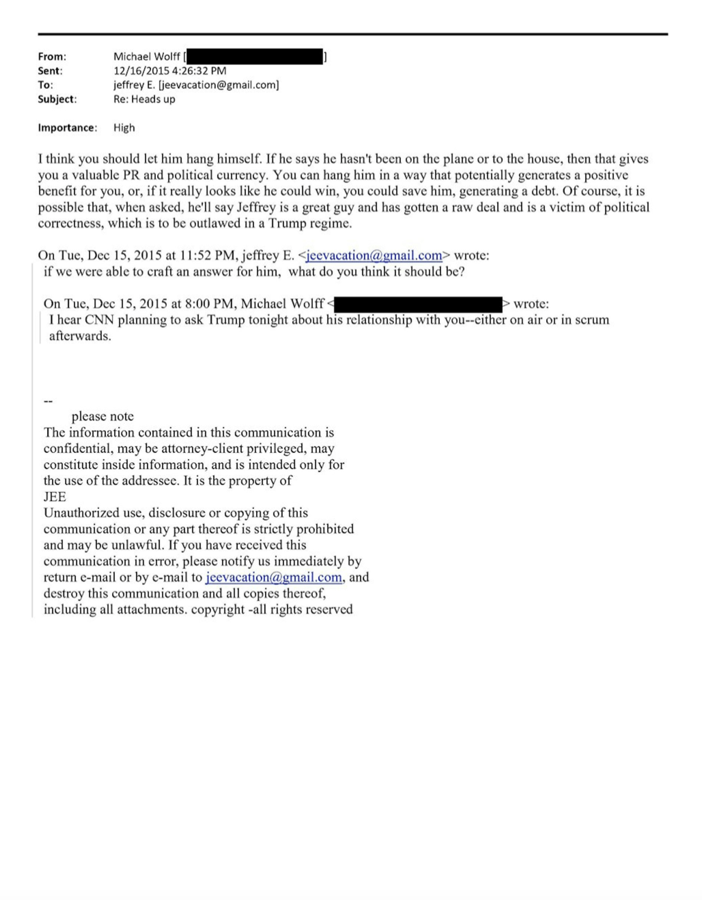 另一封日期為2015年12月15日的電郵則來自作家沃爾夫(Michael Wolff),信中提到當(dāng)時(shí)美國(guó)有線新聞網(wǎng)(CNN)計(jì)劃在共和黨初選辯論時(shí)詢問特朗普與愛潑斯坦的關(guān)系。沃爾夫建議若特朗普否認(rèn)曾到訪愛潑斯坦住所,“反而有助于愛潑斯坦的形象”。