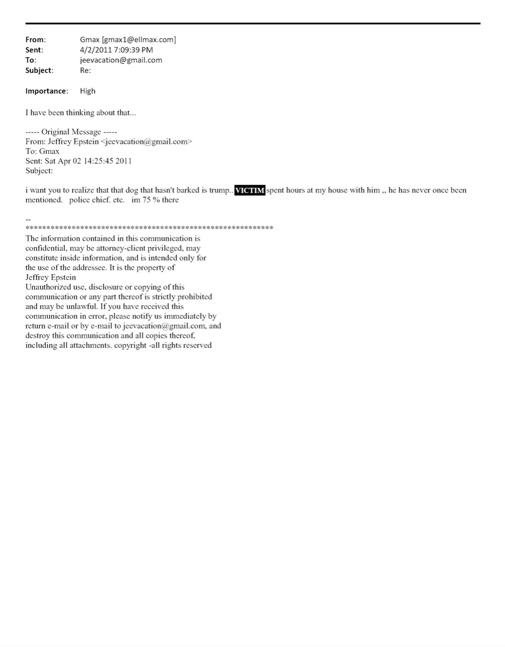 根據(jù)民主黨公布的電郵內(nèi)容,2011年4月2日,愛潑斯坦致信前女友馬克斯韋爾(Ghislaine Maxwell),在信中提到“那只還沒吠的狗”是特朗普,并暗示當(dāng)時(shí)仍為地產(chǎn)商的特朗普曾在他位于紐約的寓所與一名受害者共處數(shù)小時(shí)。