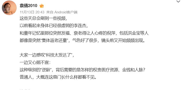 ▲內(nèi)地社交平臺(tái)熱議李連杰、洪金寶等多位明星集體“返老還童”之謎。