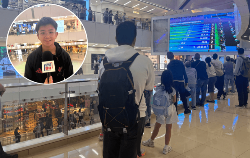 “香港女飛魚”何詩蓓早前已在全運會100米及200米自由泳贏得兩面金牌,今晚(17日)出戰(zhàn)50米自由泳及50米蛙泳,最終再摘兩面銅牌?!缎菎u頭條》記者傍晚到觀塘一直播全運會賽事的商場觀察,發(fā)現(xiàn)何詩蓓雖然在晚上7時才出戰(zhàn),但中庭早已聚集不少市民,透過大屏幕先觀看其他賽事,靜候“飛魚”登場。有視何詩蓓為榜樣的學(xué)生表示,希望日后能加入港隊,代表香港出賽。