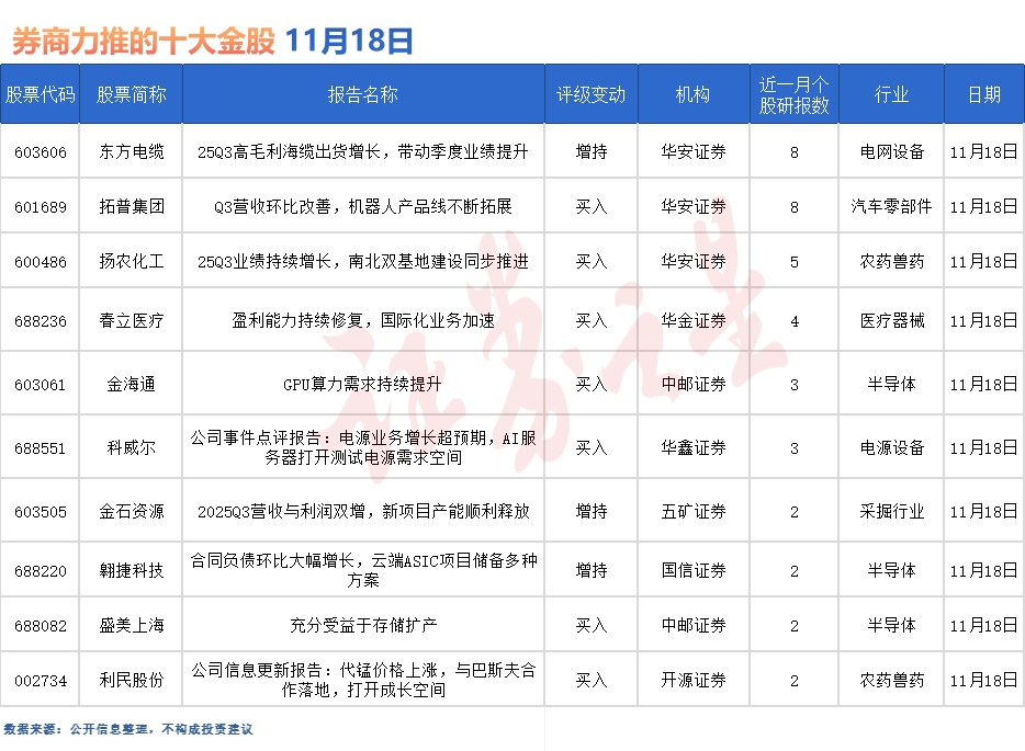 券商今日金股:8份研報(bào)力推一股(名單)
