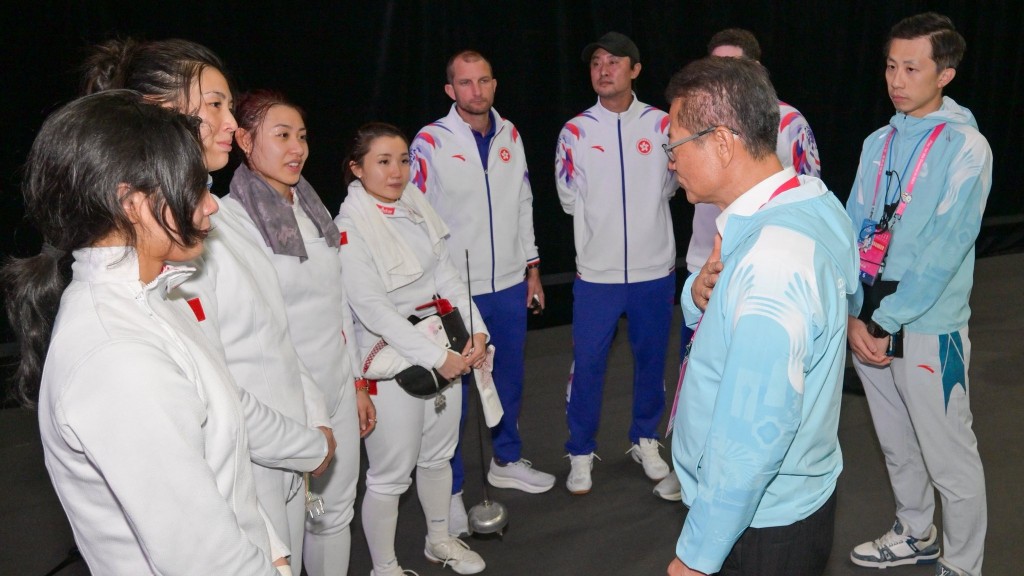 財(cái)政司司長(zhǎng)陳茂波賽后親身感謝港隊(duì)女子重劍團(tuán)體的奮力拼搏