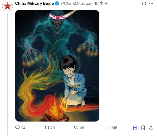 日本首相高市早苗日前發(fā)表“臺灣有事”論,中方予以強烈譴責。中國解放軍旗下媒體“中國軍號”(China Military Bugle)在社交平臺X發(fā)圖,痛批“高市早苗為日本軍國主義招魂”,20日又發(fā)布中英文對照動畫“玩火者終將引火燒身”。