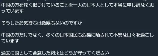 帖文大意:作為一名日本人,我對(duì)深深傷害中國(guó)人民的行為深感愧疚。請(qǐng)務(wù)必遵守國(guó)家間過(guò)去達(dá)成的承諾。