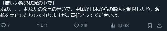 帖文大意:因?yàn)槟愕陌l(fā)言,中國(guó)限制了日本商品進(jìn)口、不鼓勵(lì)赴日出行,請(qǐng)承擔(dān)責(zé)任。