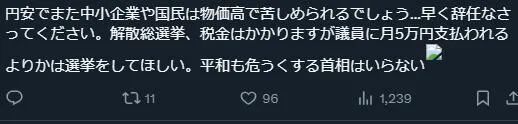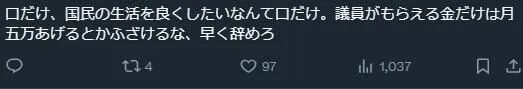 帖文大意:只會(huì)空談改善民生,卻給議員每月漲5萬(wàn)(日元)工資,太荒唐了,趕緊辭職!