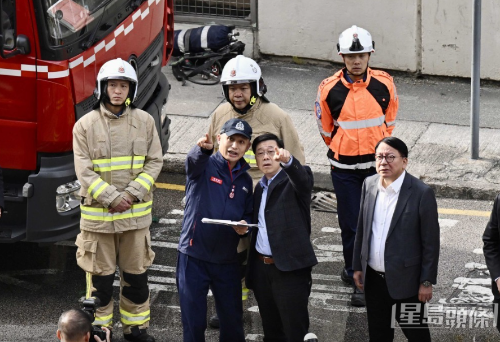 ▲消防處處長(zhǎng)楊恩健向特首李家超匯報(bào)火場(chǎng)最新進(jìn)展。劉駿軒攝