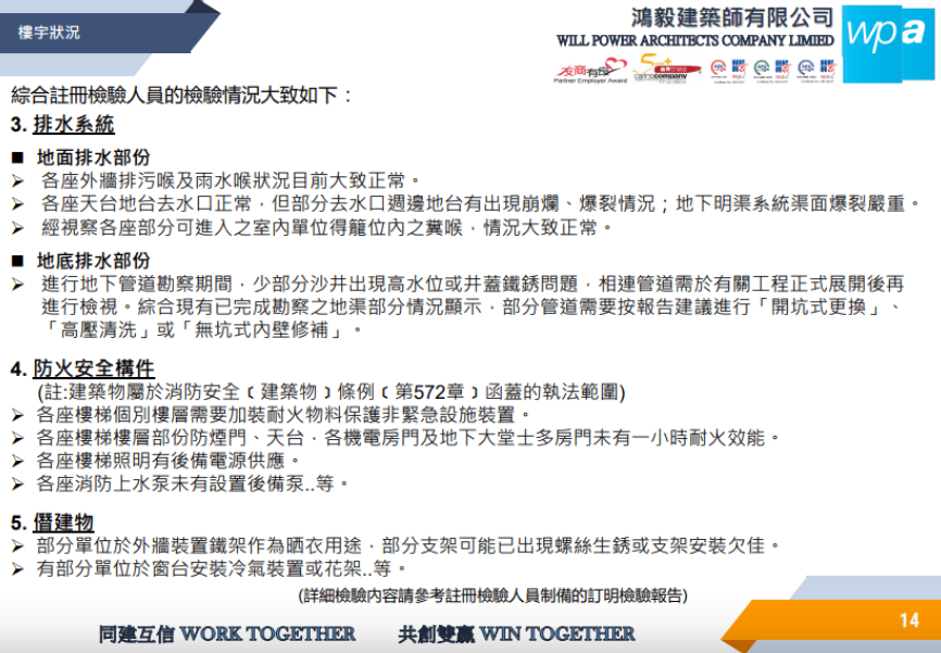 結構構件方面,報告指部分樓梯墻身、天花有小量石矢崩爛,爆裂情況,而墻身批蕩空鼓情況較多;部分樓層水表房,電表房,消防喉轆房及垃圾房內之墻身、天花有石矢剝落/磁磚崩爛情況,垃圾房內之百頁窗有部份生銹,但情況不算嚴重。
