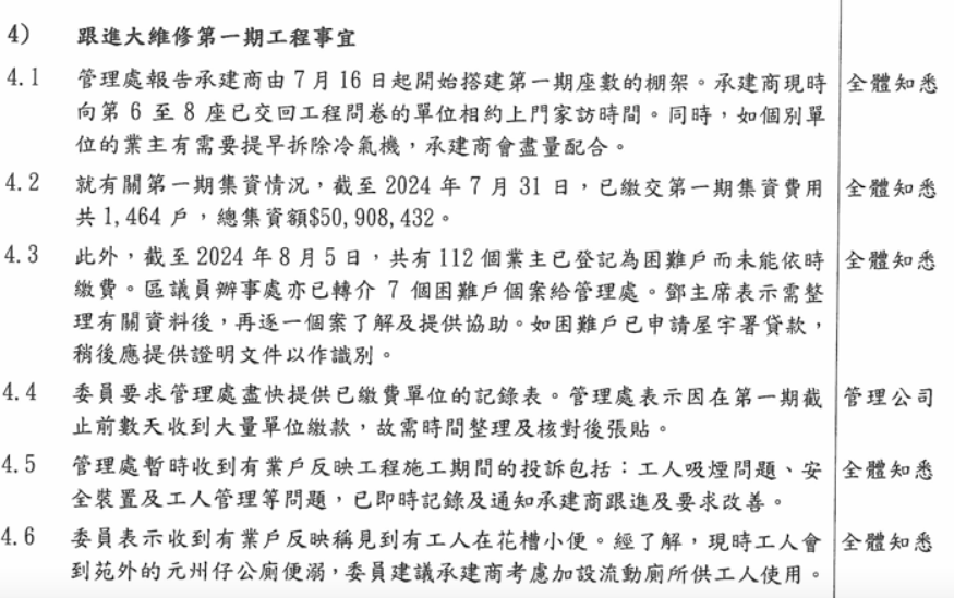 2024年8月5日的會議記錄中,業(yè)主立案法團表示收到居民投訴工人吸煙問題,并已通知承建商跟進。