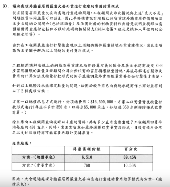 2023年7月14日,業(yè)主立案法團指接獲57個投標。于2024年1月28日會議記錄中,業(yè)主立案法團提供承建商投票率,圖表顯示“宏業(yè)建筑工程有限公司”得票率更高,費用約3.3億港元。法團亦表明集資日期會再作決定,惟后來卻一直沒有消息。及至6月3日,居民突然收到通知,每單位需集資156,602到182,702港元,并需于6個半月內分6期繳付繳交費用,法團更發(fā)律師信指,住戶需“承擔遲交或欠交大廈維修工程分攤費用而引致法團損失之一切責任或費用”。