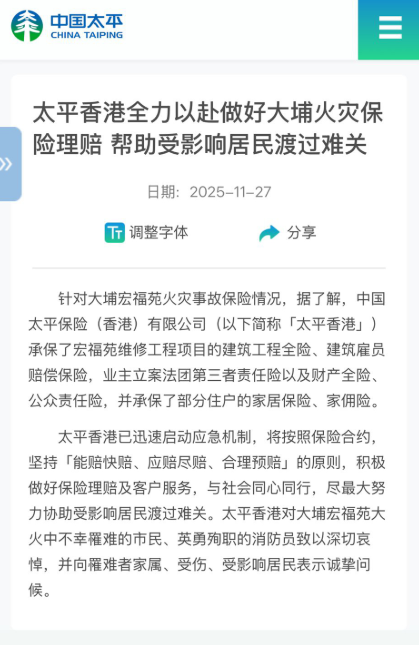 宏福苑財(cái)險(xiǎn)賠償傳上限20億港元,中國(guó)太平終確認(rèn)承保,強(qiáng)調(diào)“能賠快賠、應(yīng)賠盡賠”