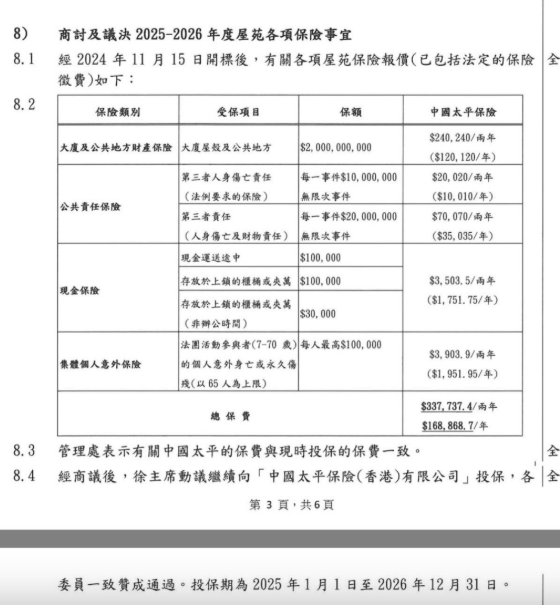 記者亦查看宏福苑業(yè)主立案法團(tuán)網(wǎng)站公開文件,發(fā)現(xiàn)去年11月及12月的第7、8次全體委員會(huì)議記錄,均顯示宏福苑的屋苑綜合保險(xiǎn)由太平香港承保。