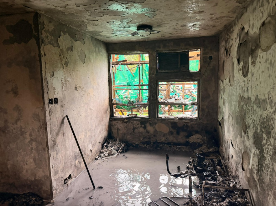 ▲DVIU上樓逐個(gè)單位搜查,部分房間物品燒成灰燼,地上仍有積水。