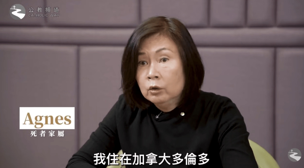 ▲婆婆的女兒Agnes在公教頻道憶述女兒憶述驟失至親的悲痛歷程,感謝香港市民,“與哭泣的一起哭泣”,又呼吁生者振作,因?yàn)槲磥怼皸l路幾漫長”。