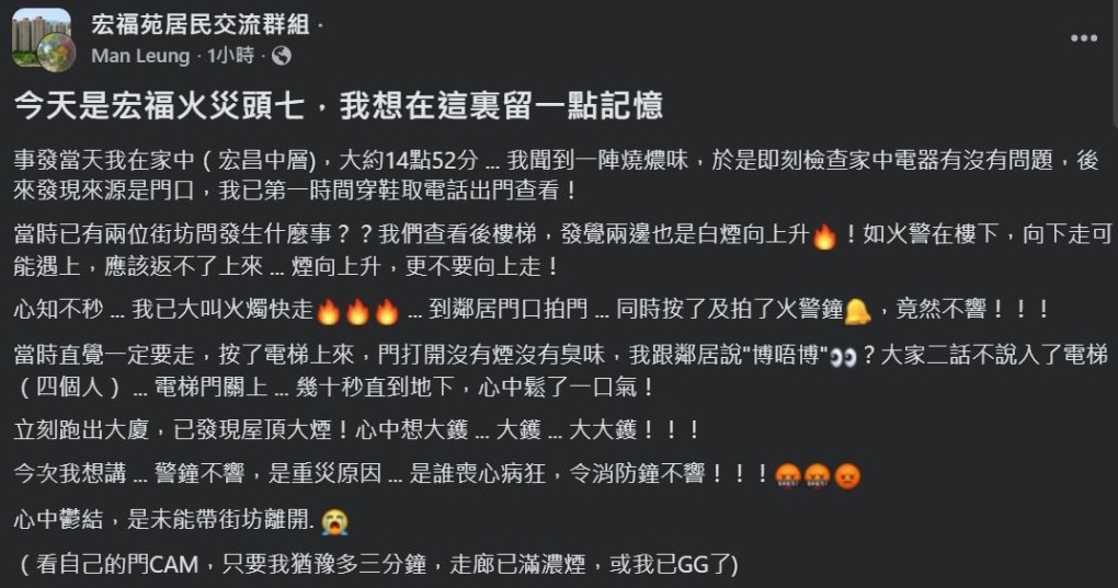 這名居民在Facebook群組“宏福苑居民交流群組”分享逃生一刻,表示自己居住宏昌閣中層。事發(fā)當日下午約2時52分,他在家中聞到燒焦味,檢查后發(fā)現(xiàn)氣味來自門口。他立即與兩位街坊查看后樓梯,發(fā)現(xiàn)兩邊均有白煙向上升。他意識到火警可能來自樓下,判斷向下逃生可能遇險,而煙向上蔓延亦不宜往上走。