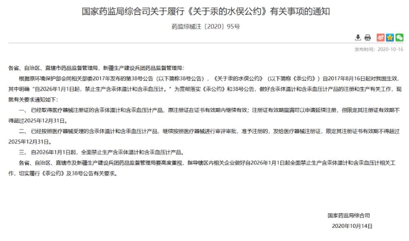 根據(jù)國家藥監(jiān)局綜合司關于履行《關于汞的水俁公約》有關事項的通知,自2026年1月1日起,禁止生產(chǎn)含汞體溫計和含汞血壓計。通知要求: