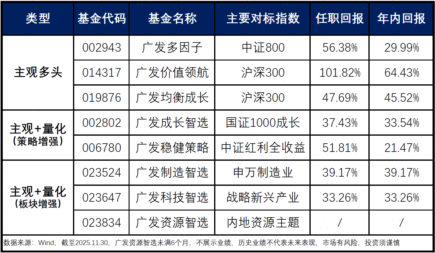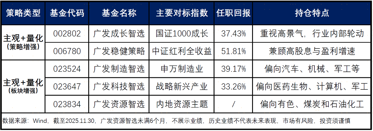 廣發(fā)資源智選(023834)、廣發(fā)科技智選(023647)、廣發(fā)制造智選(023524)均為2025年內(nèi)新發(fā)的主題增強(qiáng)型產(chǎn)品,均采用“主觀多頭+主動(dòng)量化+AI增強(qiáng)”的復(fù)合策略。