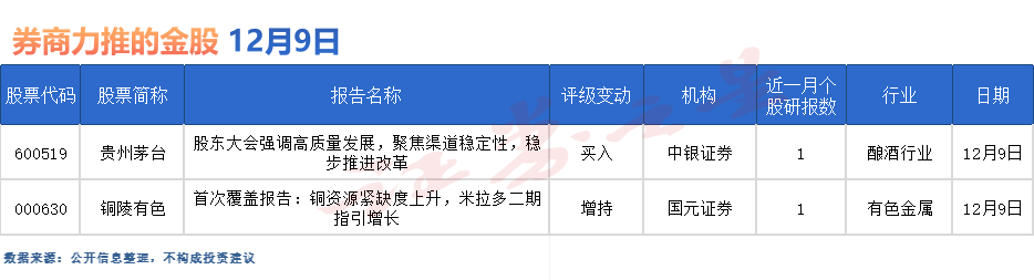 據(jù)證券之星數(shù)據(jù)庫不完全統(tǒng)計,12月9日券商共給予2家A股上市公司“買入”評級。從行業(yè)分布看,券商12月9日關(guān)注的個股聚焦于釀酒、有色金屬等行業(yè)。