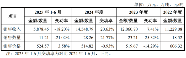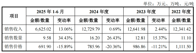 但該產(chǎn)品平均銷售價格持續(xù)走低,報告期內(nèi)分別為606.32元/噸、519.67元/噸和514.82元/噸。2025年上半年,雖然單價小幅回升3.58%至524.57元/噸,但因銷量同比下滑超過20%,該業(yè)務(wù)收入仍同比下降18.20%至5878.45萬元。