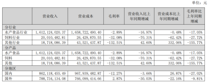 從上半年經(jīng)營(yíng)表現(xiàn)看,公司來(lái)自水產(chǎn)食品的收入同比大幅下滑16.97%,毛利率更是同比下跌17.05個(gè)百分點(diǎn)至-2.89%;分市場(chǎng)看,來(lái)自國(guó)內(nèi)和國(guó)外的收入分別同比下滑3.66%和30.03%。