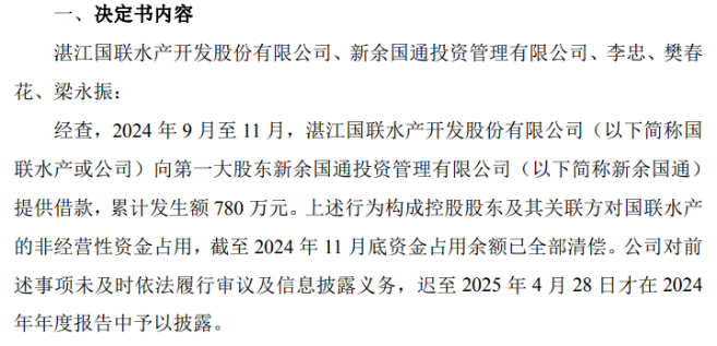 另外,廣東證監(jiān)局于今年11月向國(guó)聯(lián)水產(chǎn)、新余國(guó)通及相關(guān)上市公司高管出具的《行政監(jiān)管措施決定書(shū)》顯示,2024年9月至11月,國(guó)聯(lián)水產(chǎn)向新余國(guó)通提供借款,累計(jì)發(fā)生額780萬(wàn)元。該行為構(gòu)成控股股東及其關(guān)聯(lián)方對(duì)國(guó)聯(lián)水產(chǎn)的非經(jīng)營(yíng)性資金占用,而上市公司遲至今年4月28日才在年報(bào)中予以披露。