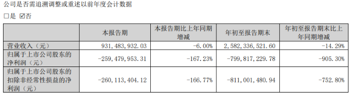 今年前三季度,公司經(jīng)營(yíng)狀況未見(jiàn)好轉(zhuǎn),頹勢(shì)延續(xù)。第三季度單季營(yíng)收同比下滑6%,降至9.31億元;歸母凈利潤(rùn)虧損2.59億元。至此,前三季度累計(jì)虧損額已擴(kuò)大至8億元。若第四季度業(yè)績(jī)無(wú)法實(shí)現(xiàn)逆轉(zhuǎn),公司將面臨連續(xù)七年虧損的嚴(yán)峻局面。(本文首發(fā)證券之星,作者|吳凡)