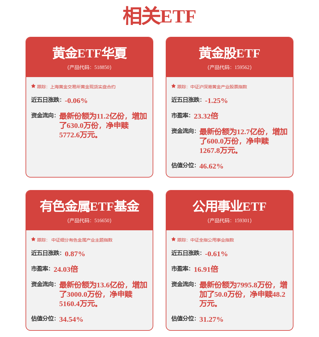 12月11日,三大股指早盤小幅拉升,其中黃金板塊持續(xù)上行。截至上午9:40,黃金ETF華夏(518850)漲0.70%、黃金股ETF(159562)漲2.17%。相關(guān)成分股中山金國際漲6.59%、紫金礦業(yè)漲4.00%、赤峰黃金漲3.66%,山東黃金、中金黃金、銅陵有色等小幅跟漲。(以上所列股票僅為指數(shù)成份股,無特定推薦之意)