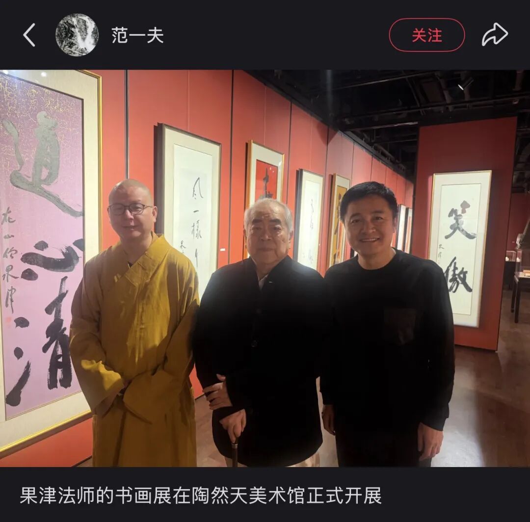 11月9日,“范一夫”的小紅書賬號(hào)再次發(fā)布了一張果津法師書畫展在陶然天美術(shù)館開(kāi)展的照片,范曾也出現(xiàn)在照片中。