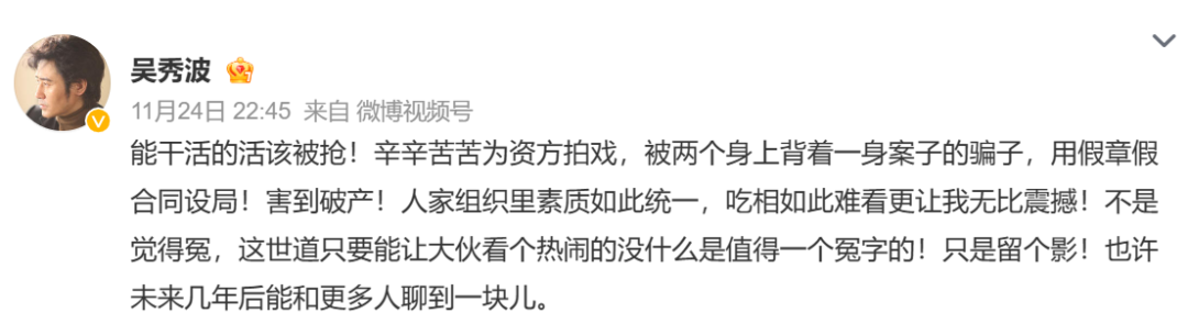 隨后,吳秀波個(gè)人社交賬號(hào)連發(fā)兩條動(dòng)態(tài),對(duì)此事作出回應(yīng),稱“辛辛苦苦為資方拍戲,被身上背著一身案子的騙子,用假章假合同設(shè)局,害到破產(chǎn)”。
