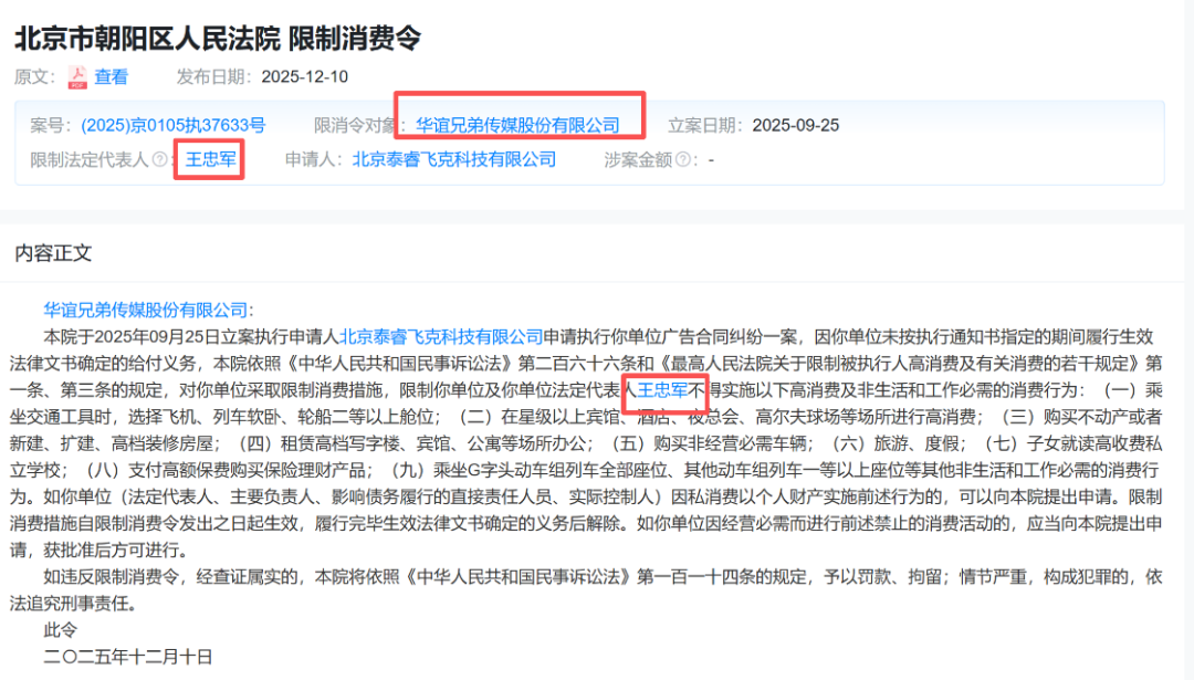此外,天眼查顯示,近日華誼兄弟及其法定代表人王忠軍新增一則限制消費令,涉及廣告合同糾紛案件,申請人為北京泰睿飛克科技有限公司,執(zhí)行法院為北京市朝陽區(qū)人民法院。