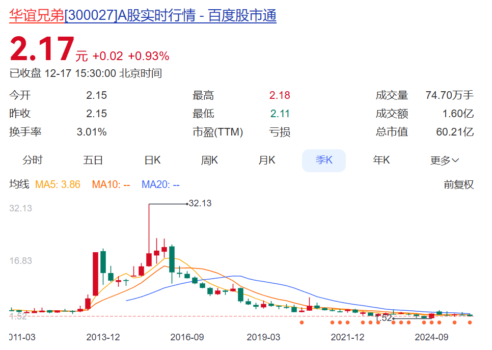 資本市場上,華誼兄弟近年來股價持續(xù)走低,截至17日收盤報2.17元,總市值僅剩60.21億元,不及巔峰時十分之一。