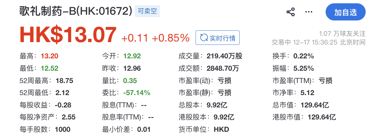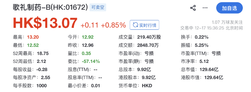 歌禮制藥于2018年8月1日在香港上市,為香港第一家上市的18A未盈利生物科技公司。截至發(fā)稿,歌禮制藥股價(jià)漲0.85%,報(bào)13.07億港元,總市值129.64億港元。