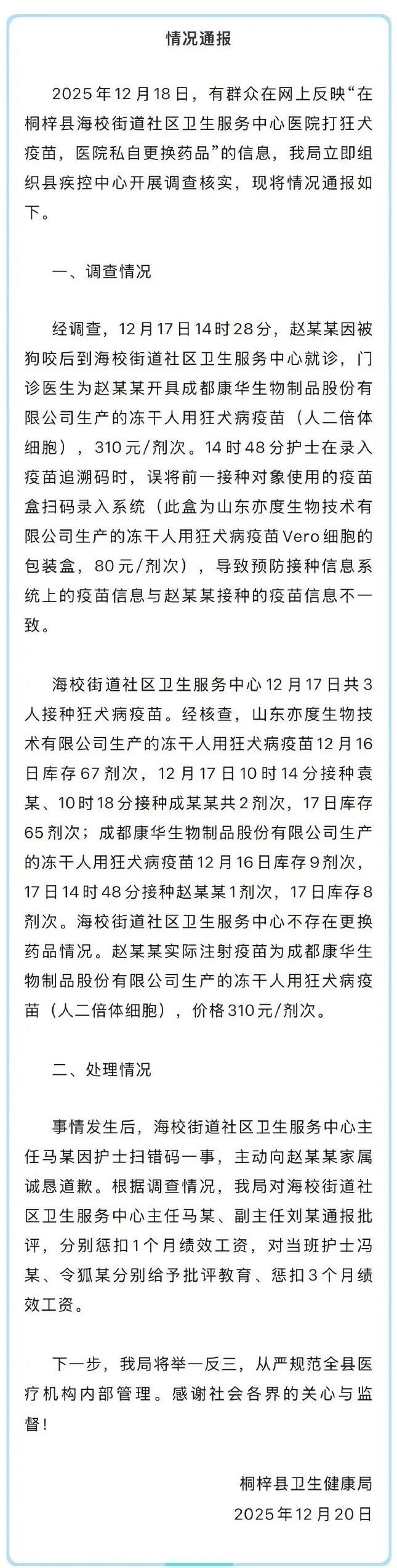 2025年12月18日,有群眾在網(wǎng)上反映“在桐梓縣海校街道社區(qū)衛(wèi)生服務(wù)中心醫(yī)院打狂犬疫苗,醫(yī)院私自更換藥品”的信息,事情發(fā)生后,海校街道社區(qū)衛(wèi)生服務(wù)中心主任馬某因護(hù)士掃錯(cuò)碼一事,主動(dòng)向趙某某家屬誠懇道歉。根據(jù)調(diào)查情況,該局對海校街道社區(qū)衛(wèi)生服務(wù)中心主任馬某、副主任劉某通報(bào)批評,分別懲扣1個(gè)月績效工資,對當(dāng)班護(hù)士馮某、令狐某分別給予批評教育、懲扣3個(gè)月績效工資。