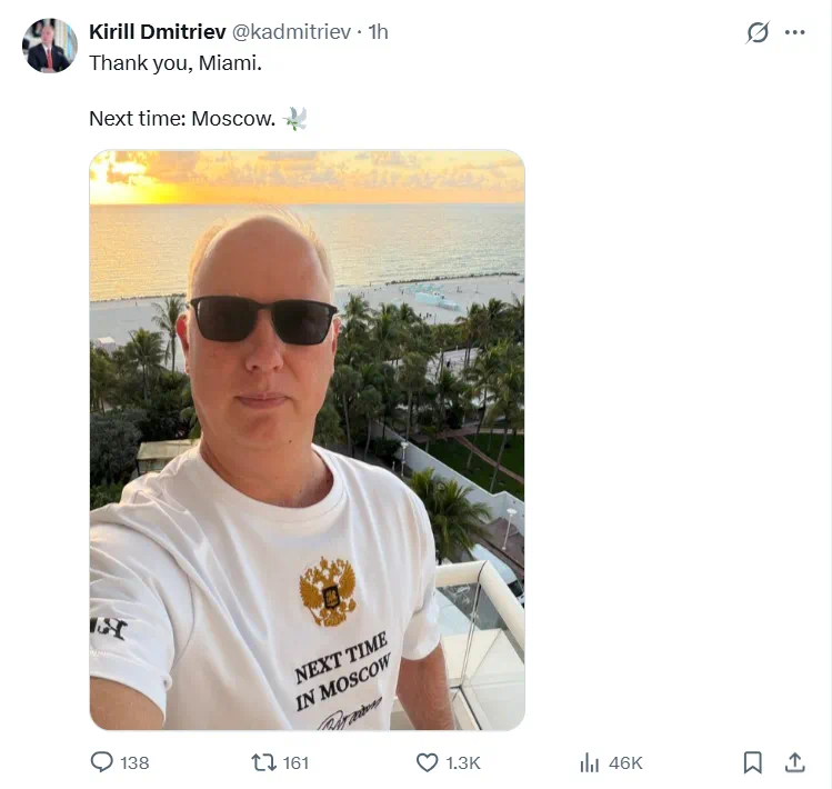 當(dāng)?shù)貢r間21日,德米特里耶夫在社交平臺X上發(fā)布了一張以邁阿密日落為背景的自拍照。照片中,他身著一件印有俄羅斯國徽的白色T恤,T恤上印有“下次莫斯科見”的字樣以及俄羅斯總統(tǒng)普京的簽名。據(jù)報道,此前在阿拉斯加會晤期間,普京曾用這句英文原話邀請美國總統(tǒng)特朗普赴莫斯科舉行會談。