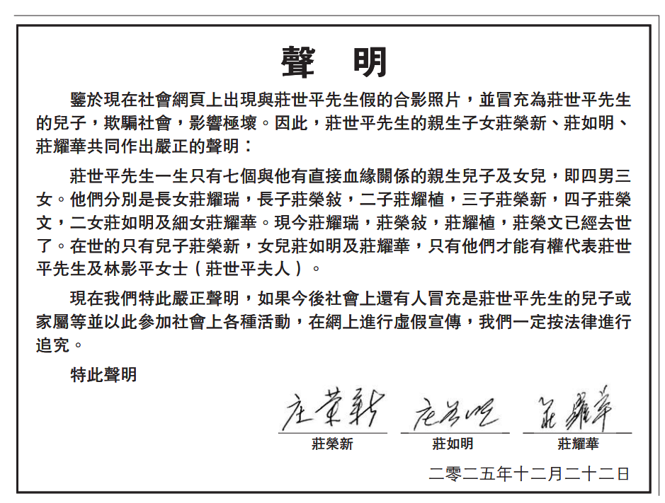 12月22日,莊世平先生親屬在香港《大公報》刊發(fā)聲明:鑒于現(xiàn)在社會網(wǎng)頁上出現(xiàn)與莊世平先生假的合影照片,并冒充為莊世平先生的兒子,欺騙社會,影響極壞。因此,莊世平先生的親生子女莊榮新、莊如明、莊耀華共同作出嚴(yán)正的聲明。