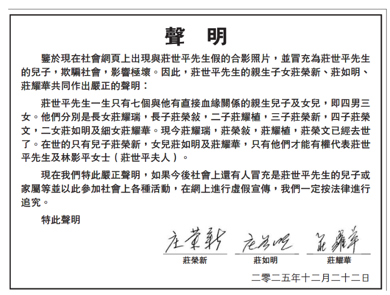 莊世平先生親屬在聲明中表示,莊世平先生一生只有七個與他有直接血緣關(guān)系的親生兒子及女兒,即四男三女。他們分別是長女莊耀瑞,長子莊榮敍,二子莊耀植,三子莊榮新,四子莊榮文,二女莊如明及細(xì)女莊耀華?,F(xiàn)今莊耀瑞,莊榮敍,莊耀植,莊榮文已經(jīng)去世了。在世的只有兒子莊榮新,女兒莊如明及莊耀華,只有他們才能有代表莊世平先生及林影平女士(莊世平夫人)。