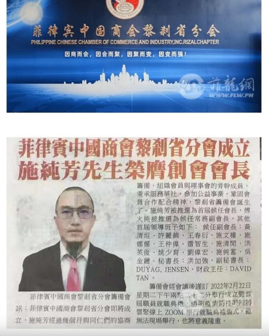 網(wǎng)上流傳的照片顯示,施純芳幾年前擔(dān)任菲律賓中國(guó)商會(huì)黎剎省分會(huì)首屆會(huì)長(zhǎng),照片留著小胡子,還有華社刊登廣告祝賀他“眾望所歸”。