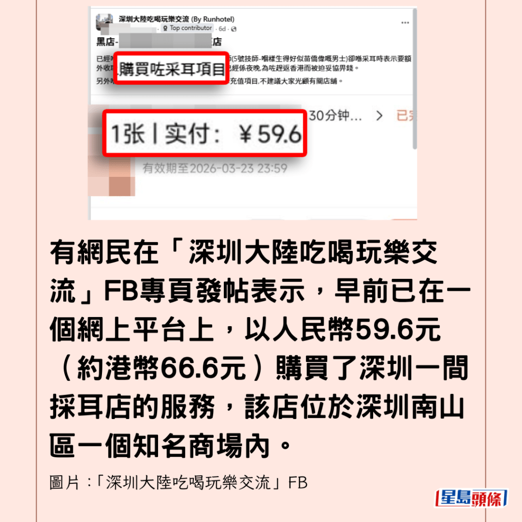 有網(wǎng)民在“深圳大陸吃喝玩樂交流”FB專頁發(fā)帖表示,早前已在一個(gè)網(wǎng)上平臺(tái)上,以人民幣59.6元(約港幣66.6元)購買了深圳一間采耳店的服務(wù),該店位于深圳南山區(qū)一個(gè)知名商場內(nèi)。