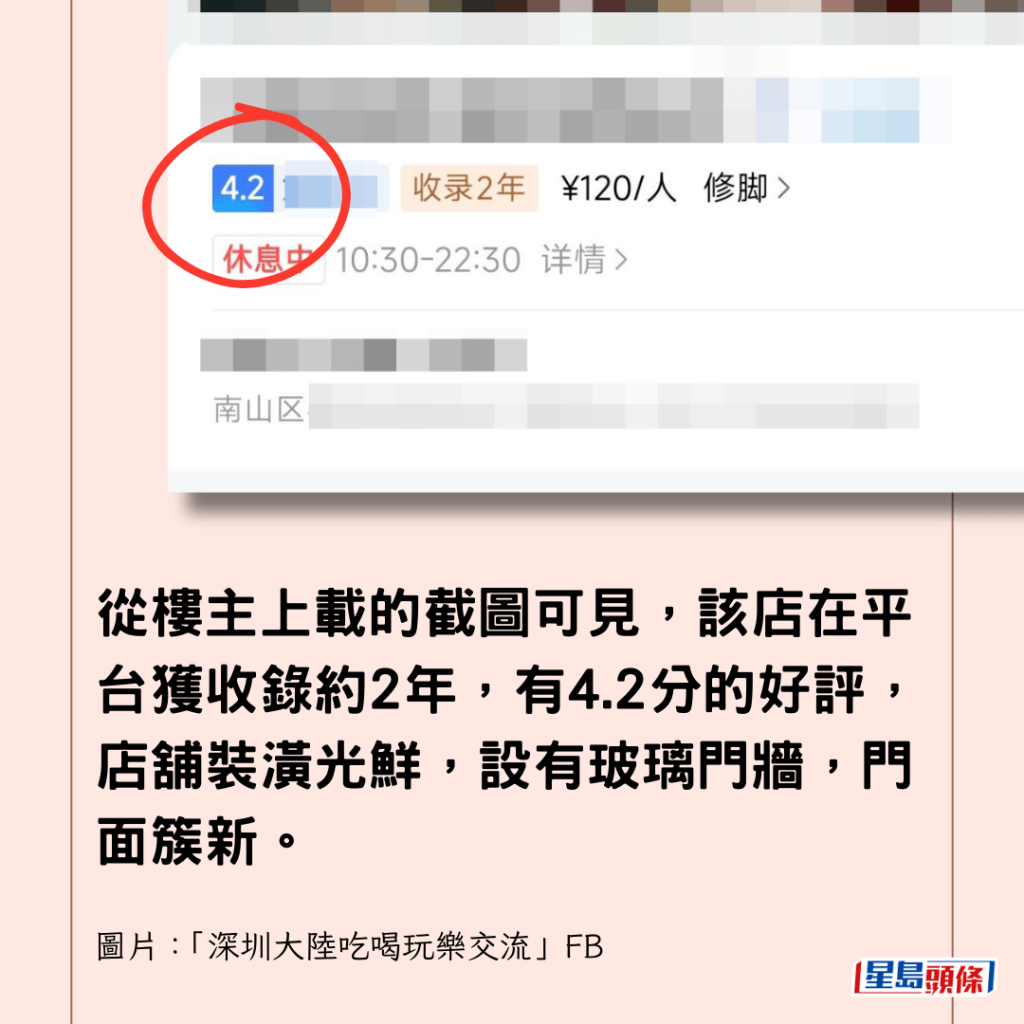 從樓主上載的截圖可見,該店在平臺(tái)獲收錄約2年,有4.2分的好評(píng),店鋪裝潢光鮮,設(shè)有玻璃門墻,門面簇新。