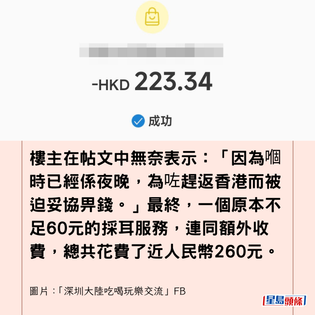 樓主在帖文中表示,他在享受服務(wù)時(shí),一位被形容為“嗰樣生得好似苗僑偉”的男技師,在采耳途中突然表示樓主的耳屎太多,要求額外再收取人民幣200元(約港幣223.34元)才肯繼續(xù)清理。樓主在帖文中無奈表示:“因?yàn)閱駮r(shí)已經(jīng)系夜晚,為咗趕返香港而被迫妥協(xié)畀錢?!弊罱K,一個(gè)原本不足60元的采耳服務(wù),連同額外收費(fèi),總共花費(fèi)了近人民幣260元。