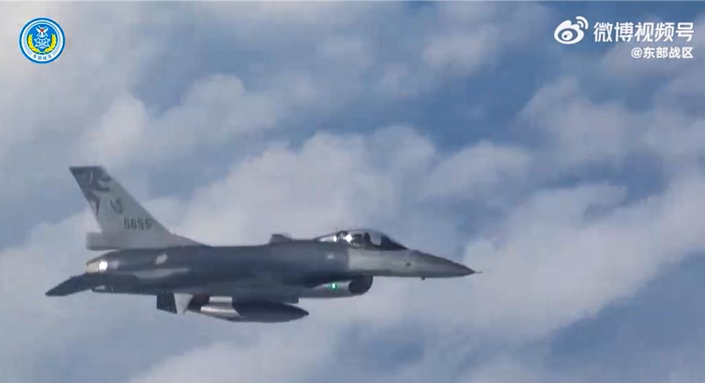 ▲解放軍昨公布軍演影片見臺(tái)F-16(如圖)、空軍基地及火箭著彈畫面。(圖/微博@東部戰(zhàn)區(qū))