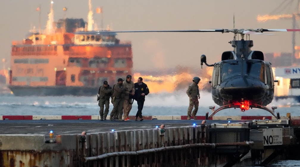 ▲馬杜羅戴上手銬,由直升機(jī)送往紐約法庭。 路透社