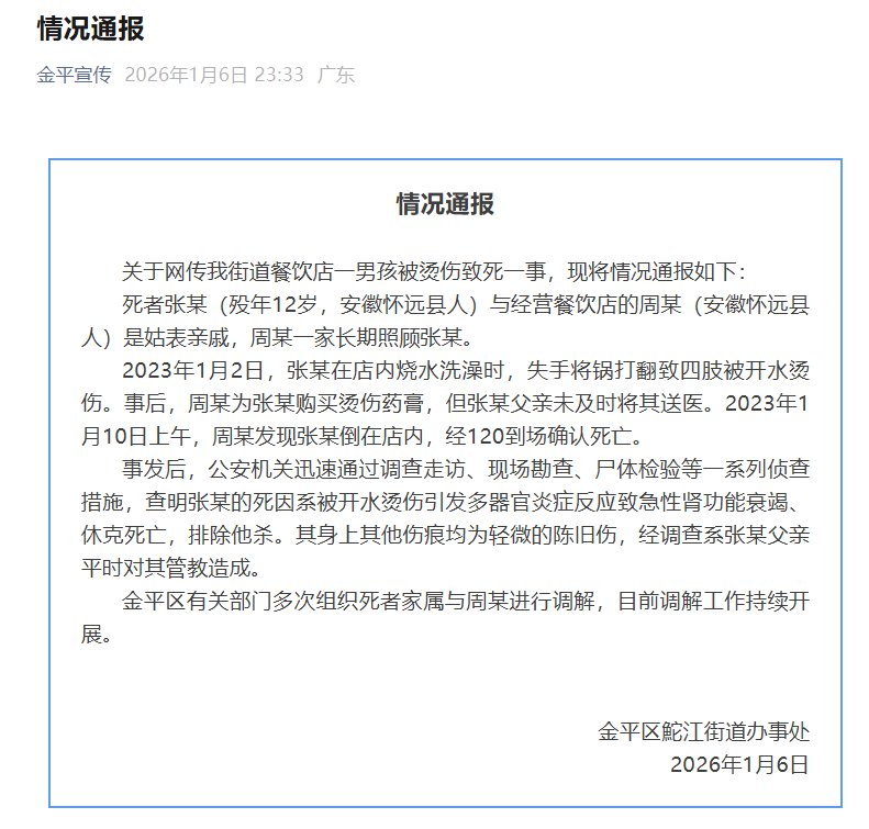 關(guān)于網(wǎng)傳我街道餐飲店一男孩被燙傷致死一事,現(xiàn)將情況通報(bào)如下: