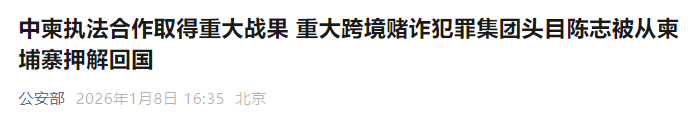 1月7日,在柬埔寨有關部門支持配合下,公安部派出工作組,成功將重大跨境賭詐犯罪集團頭目陳志(中國籍)從柬埔寨金邊押解回國。這是中柬執(zhí)法合作取得的又一重大戰(zhàn)果。