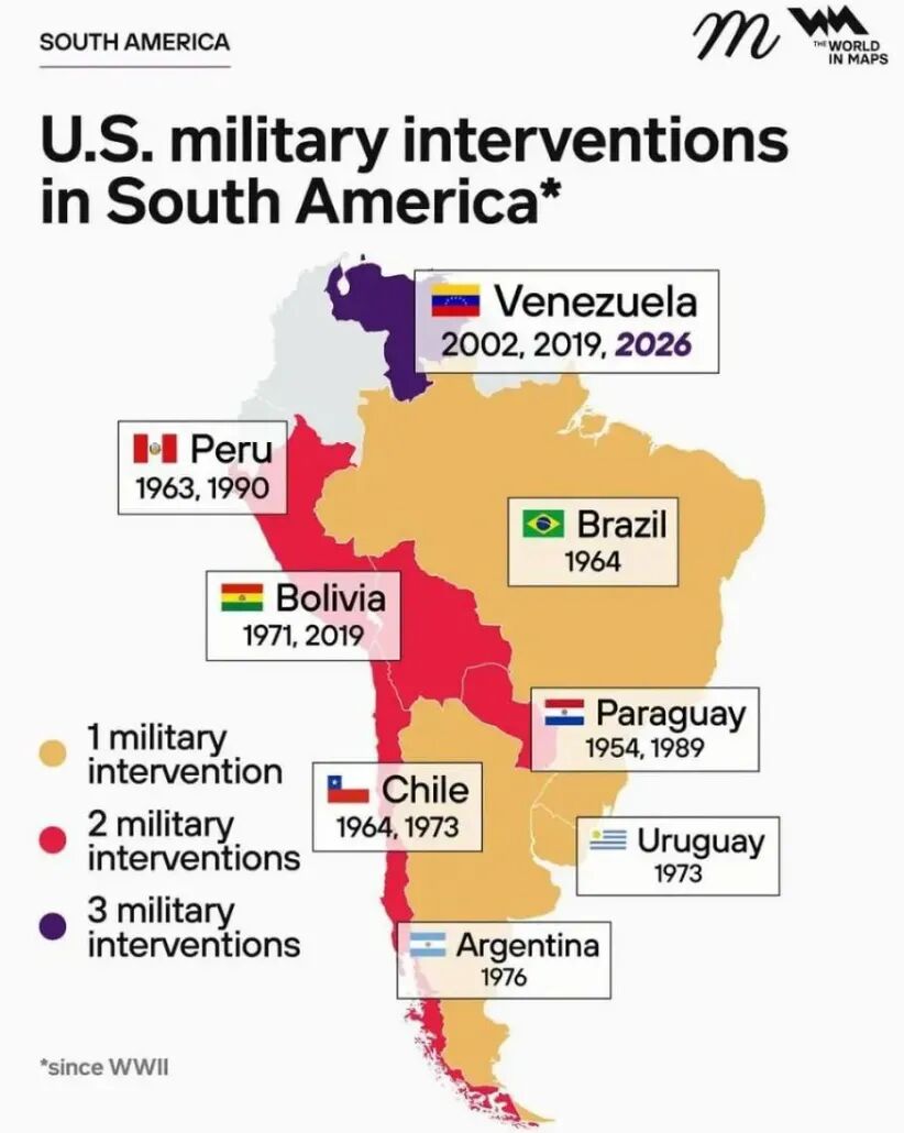 最后,有網(wǎng)民在諾頓的帖文下貼出了一張圖片,上面記錄了自二戰(zhàn)結(jié)束以來,美國對拉美多個國家進行的軍事干預(yù)。