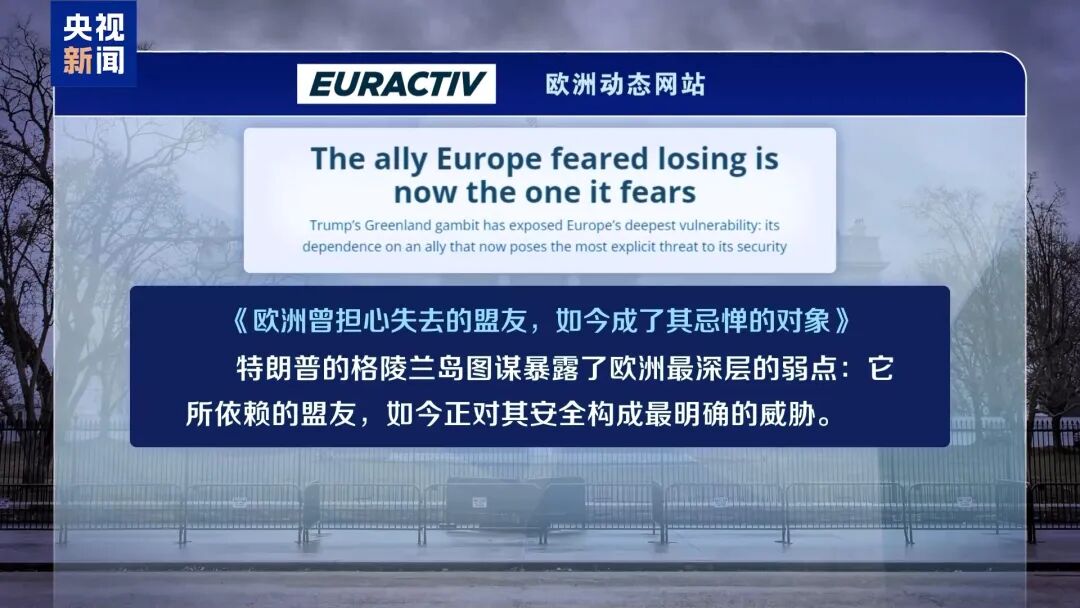 歐洲動(dòng)態(tài)網(wǎng)站6日以《歐洲曾擔(dān)心失去的盟友,如今成了其忌憚的對象》為題評論說,“特朗普的格陵蘭島圖謀暴露了歐洲最深層的弱點(diǎn):它所依賴的盟友,如今正對其安全構(gòu)成最明確的威脅?!蔽恼逻€提醒說,我們正進(jìn)入一個(gè)“強(qiáng)權(quán)即公理”的新世界——而歐洲人對此毫無準(zhǔn)備。或許,格陵蘭島可能帶來的羞辱,將促使歐洲人反思這一現(xiàn)狀,并最終采取行動(dòng)改變局面。