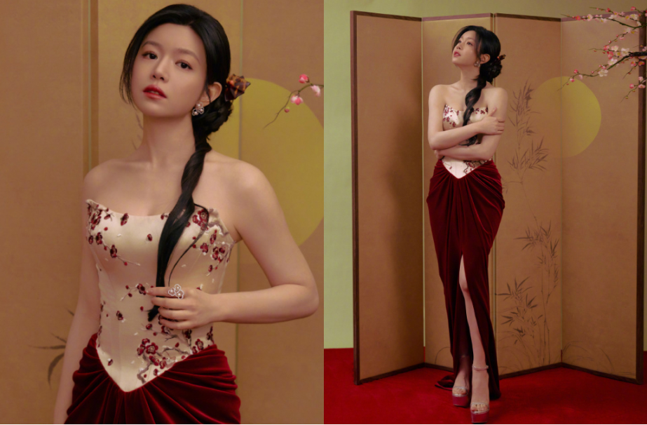 照片中,她置身中式屏風(fēng)前,背景以溫潤色調(diào)搭配梅花點綴,整體畫面充滿古典氛圍,陳妍希身穿米白色立體刺繡馬甲式上衣,細致花朵點綴胸前線條,勾勒出纖細身形;下半身則搭配酒紅色絲絨長裙,高衩設(shè)計若隱若現(xiàn)露出修長美腿,腳踩細帶高跟鞋,優(yōu)雅中帶著成熟女人味,將長發(fā)編成側(cè)邊低辮,搭配小巧耳環(huán),氣質(zhì)清新又不失嫵媚。